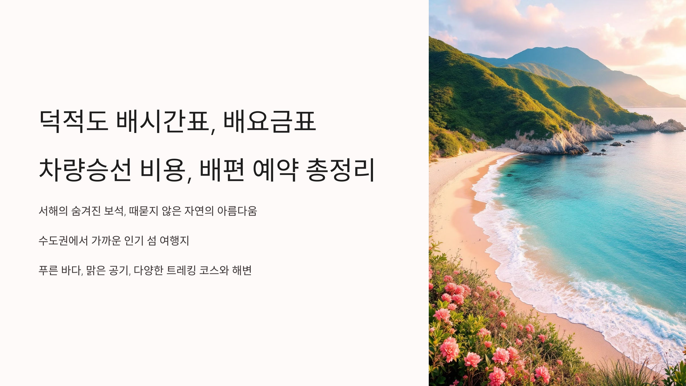 서해의 숨겨진 보석, 때묻지 않은 자연의 아름다움을 간직한 덕적도는 수도권에서 비교적 가까워 많은 이들에게 사랑받는 섬 여행지입니다. 푸른 바다와 맑은 공기, 그리고 다양한 트레킹 코스와 해변은 방문객들에게 잊지 못할 추억을 선사합니다. 덕적도 여행의 첫걸음은 바로 배편을 이용하는 것! 인천에서 출발하여 아름다운 덕적도로 향하는 배편의 모든 것을 더욱 상세하게, 그리고 읽기 쉽도록 정리했습니다. 배시간표부터 요금, 차량 승선 비용, 그리고 예약 방법까지, 덕적도 여행 준비를 위한 완벽한 가이드가 되어드릴게요!