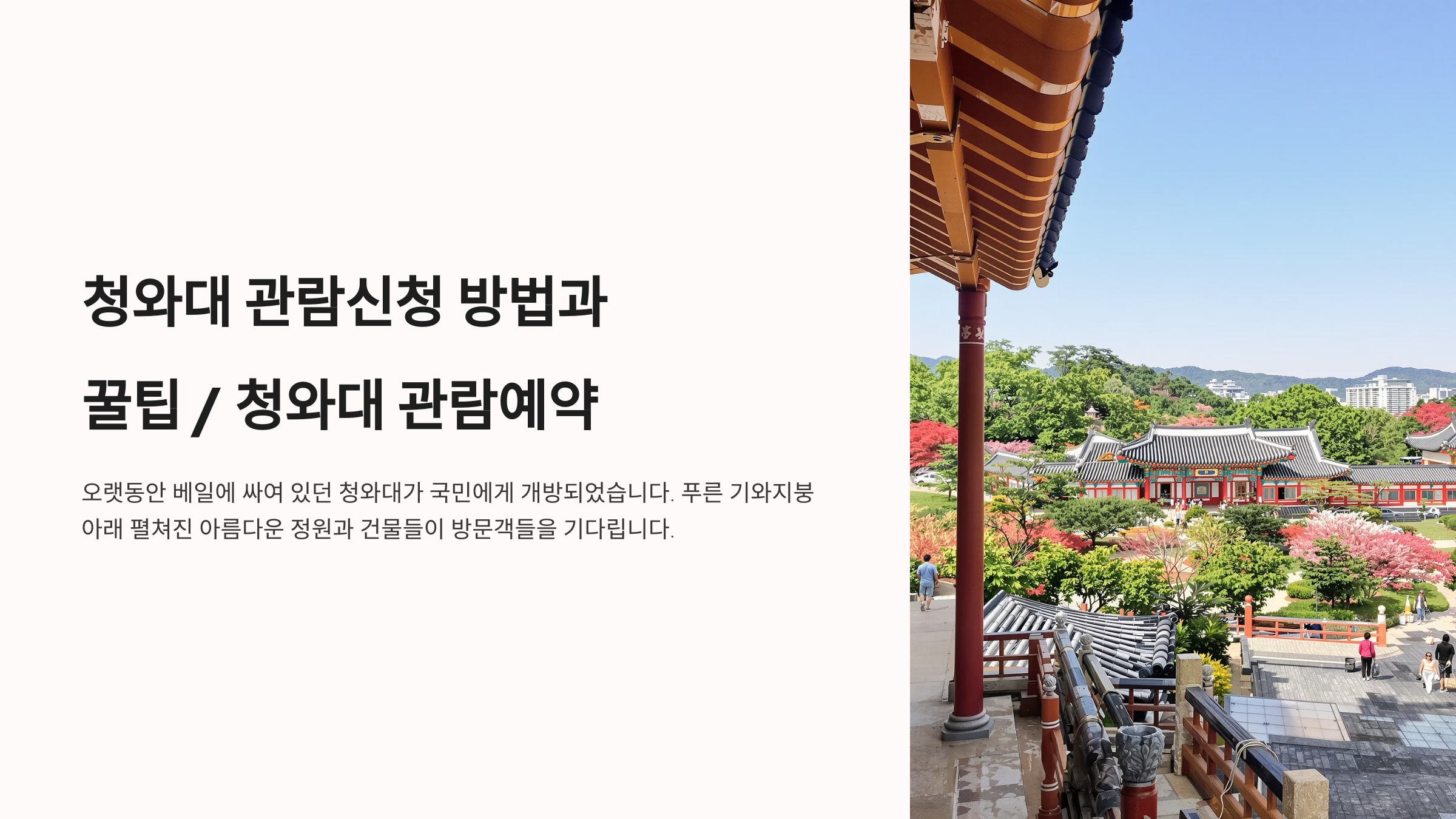 오랫동안 베일에 싸여 있던 청와대가 국민에게 개방된 이후, 많은 분들이 그 역사적인 공간을 방문하고 있습니다. 푸른 기와지붕 아래 펼쳐진 아름다운 정원과 건물들은 방문객들에게 깊은 인상을 남깁니다. 하지만 처음 청와대 관람을 신청하려 하면 다소 복잡하게 느껴질 수 있습니다. 그래서 오늘은 청와대 관람 신청 방법부터 방문 시 알아두면 유용한 꿀팁까지, 여러분의 청와대 나들이를 완벽하게 만들어 줄 모든 정보를 자세히 알려드리겠습니다. 이 글을 통해 쉽고 편리하게 청와대 관람을 준비해 보세요!